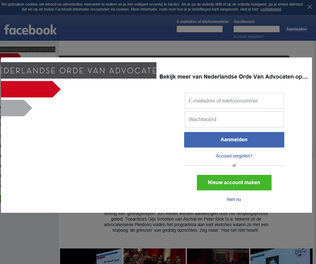 Nog erger maakt de NOvA het door in het aan de advocaten gerichte nieuwsbericht van 15 december een fotoserie over een bijeenkomst van 7 december jl. over de gedragsregels voor de advocatuur aan te kondigen, die blijkt te zijn geplaatst op een internetpagina van het grootste marketingbedrijf van de aardbol, Facebook. De NOvA leent zich voor het door dat bedrijf maken van reclame voor hun dienst, diefstal van persoonsgegevens ten behoeve van hun klanten.