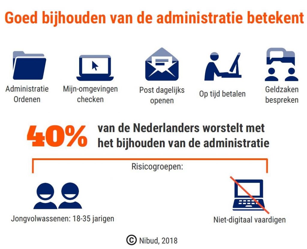 - Nibud: minstens 40 procent van de Nederlanders worstelt met de financiële administratie, 16 april 2018. Het Nibud onderscheidt twee risicogroepen: de 18 tot 35-jarigen (34 procent van de Nederlanders van 18 tot 64 jaar) en de niet-digitaal vaardigen (minstens 1 op de 5 volwassenen). Lees verder het rapport ‘Financiële administratie in een digitaal tijdperk’.