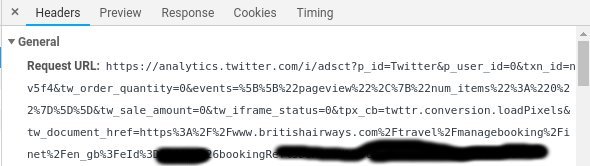 Recently, I tried to check-in online on your website, but the interstitial page did not redirect me, and thus I was unable to check-in. I discovered that this was because my adblocker was enabled. After disabling my adblocker, I discovered that your check-in page was leaking my booking reference and surname to countless third parties for advertising purposes, including Twitter, LinkedIn and Google Doubleclick. I’ve attached for some network logs from Chrome’s web developer console for some example evidence.
