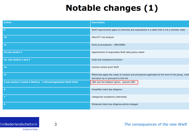 Het onjuiste ‘terugvaloptie’ verhaal wordt ook door De Nederlandsche Bank (DNB) aan het publiek verteld, zo blijkt uit een recent bekend gemaakte Engelstalige presentatie over de wijzigingen in de Wwft. Daarin wordt gesproken over “UBO and the fallback option; pseudo-UBO“.