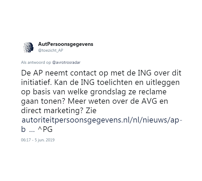 Als een klant gebruik maakt van producten en diensten van een bank beschikt de bank over persoonsgegevens van die klant. Op het verwerken (waaronder gebruik) van persoonsgegevens is sinds 25 mei 2018 de Algemene verordening gegevensbescherming (AVG) en de daarop gebaseerde uitvoeringsregelgeving van toepassing. Gelet hierop is ook bij de Nederlandse toezichthouder op deze regelgeving, de Autoriteit Persoonsgegevens (AP) informatie ingewonnen naar aanleiding van de berichtgeving. De AP heeft aangegeven dat de desbetreffende wijziging van het Privacy Statement door ING bij de AP vragen heeft opgeroepen. Naar aanleiding hiervan heeft de AP aan ING, op basis van de in de AVG opgenomen verantwoordingsplicht, gevraagd om op korte termijn een onderbouwing van de rechtmatigheid van de voorgenomen gegevensverwerking aan te leveren.