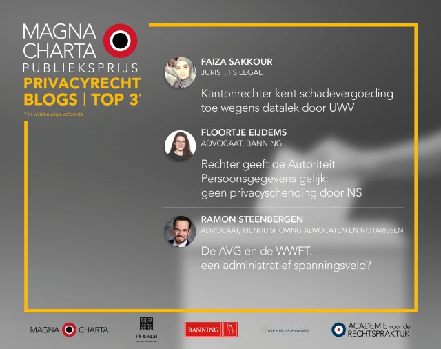 Vandaag kreeg ik van Academie voor de Rechtspraktijk bericht dat ik in de top 3 van de Magna Charta Publieksprijs ben geëindigd, in de rubriek artikelen Privacyrecht. Ik ben daardoor een van de drie kanshebbers voor de prijs in deze rubriek, die op 31 januari a.s. wordt uitgereikt.