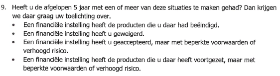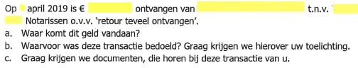 Het is hoogst merkwaardig dat een bank vragen stelt over geldverkeer met een notaris, die zelf onder de Wwft valt. Om aan een gepensioneerde consument vragen te stellen over ‘geldstromen’ in de toekomst, is al helemaal vreemd. Als een bank een jaar na het aangaan vragen stelt als hierboven vermeld, geeft de bank daarmee aan het inleidend cliëntenonderzoek niet goed te hebben verricht.