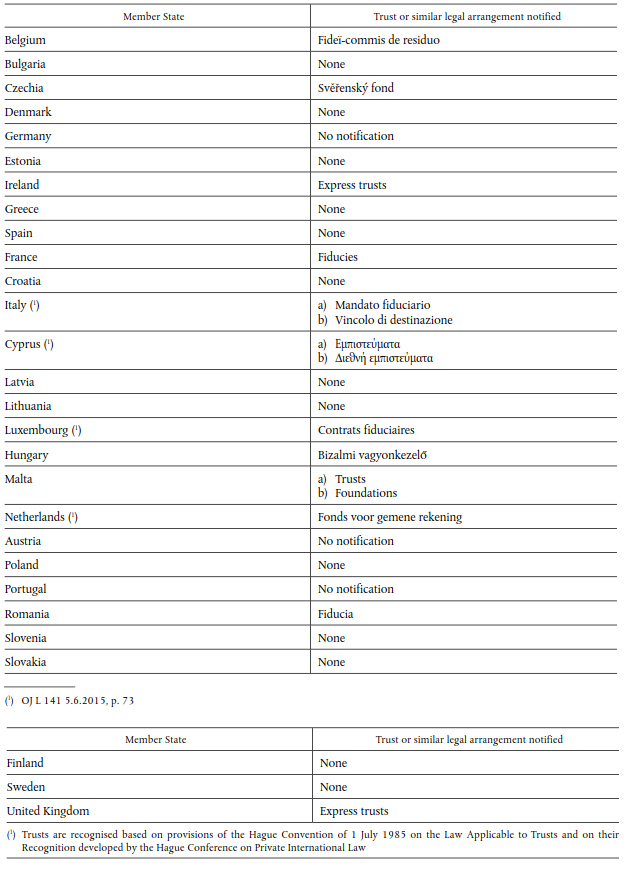 Drie landen hebben nog geen opgave gedaan (Duitsland, Oostenrijk, Portugal). Een deel van de landen zegt dat er geen soortgelijke juridische constructies zijn.