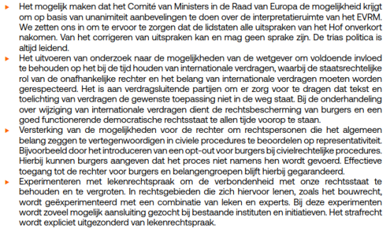 Egbert Myjer (bijzonder hoogleraar mensenrechten) schreef voor het NJCM-Bulletin het artikel ‘Het zelfreinigend vermogen van de VVD‘. Daarin bespreekt hij de rol van het internationale recht in Nederland en constateert dat de eerder bekritiseerde tekst door de VVD is vervangen door het bovenstaande. Hij schrijft: