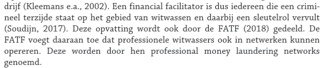 Lees pagina 3 en 4 van het artikel over het begrip ‘facilitator’ dat zowel degenen omvat die welbewust meewerken aan het ontwerpen van structuren ten behoeve van criminelen, als degenen die zorgen voor de belastingaangifte of de overdracht van aandelen, zonder dat zij weten met een crimineel te maken hebben. Nu criminelen net als iedere burger belastingaangifte moeten doen en dan een belastingadviseur nodig hebben, is die belastingadviseur een facilitator. Citaat: