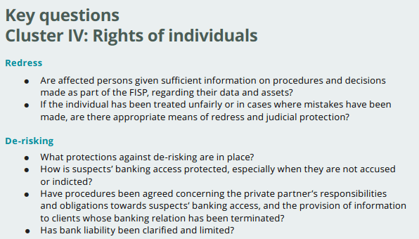 In het artikel ontbreekt focus op het feit dat opsporing van terrorismefinanciering door private partijen (zoals banken) praktisch betekent dat je hen persoonsgegevens van vermoedelijke terroristen geeft. Dat er een democratische en juridische basis moet zijn voor het door de overheid met de banken uitwisselen van gegevens, spreekt voor zich, evenals afleggen van verantwoording (accountability).