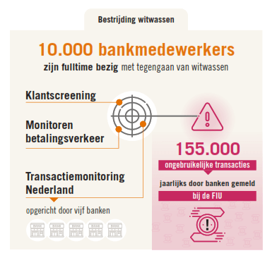 Banken monitoren meer dan tien miljard betaaltransacties per jaar en onderzoeken jaarlijks honderdduizenden alerts, waarbij ongebruikelijke transacties worden gemeld aan de Financial Intelligence Unit (FIU). Het aantal opsporingen wat hieruit volgt is minimaal. Dit heeft te maken met beperkte capaciteit bij FIU en opsporingsdiensten en met het grote aantal meldingen door banken. Versterking van de capaciteit in de gehele keten en optimale samenwerking binnen die keten is essentieel.