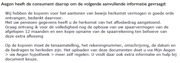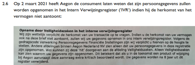 Aegon kende dus de herkomst van het het vermogen waarmee werd afgelost. Er werd een aanvullende vraag gesteld, waarvan ik de logica niet begrijp; het ging om aflossingen van € 20.000 en € 5.000, dus geen schokkend hoge bedragen. Het cliëntenonderzoek hoort proportioneel te zijn. Als de klant weigert de informatie te verstrekken, kondigt Aegon aan dat de gegevens van de klant in de interne zwarte lijst, het IVR, zullen worden opgenomen: