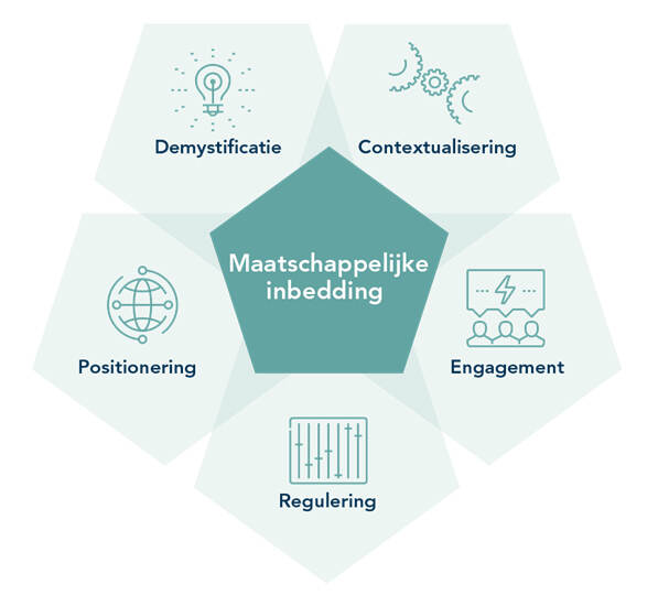 AI is een systeemtechnologie, te vergelijken met elektriciteit en de verbrandingsmotor. Een systeemtechnologie heeft een grote impact op de samenleving, die vooraf niet kan worden voorzien. Om een systeemtechnologie als AI in te bedden is een integrale aanpak vereist, met intensieve betrokkenheid van de overheid. De WRR onderscheidt daarbij vijf opgaven: demystificatie, contextualisering, engagement, regulering en positionering.