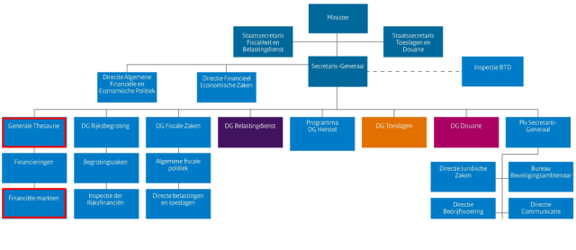 De Directie Financiële Markten (FM), onderdeel van de Generale Thesaurie, is verantwoordelijk voor het beleid en de wetgeving die misbruik van de financiële sector beoogt te voorkomen, zoals witwassen en terrorismefinanciering en de uitvoering van financiële sancties. Opvallend is dat de rechtsstatelijkheid een aandachtspunt is bij het Directoraat-Generaal Belastindienst, terwijl ik dat thema bij FM niet tegenkom.