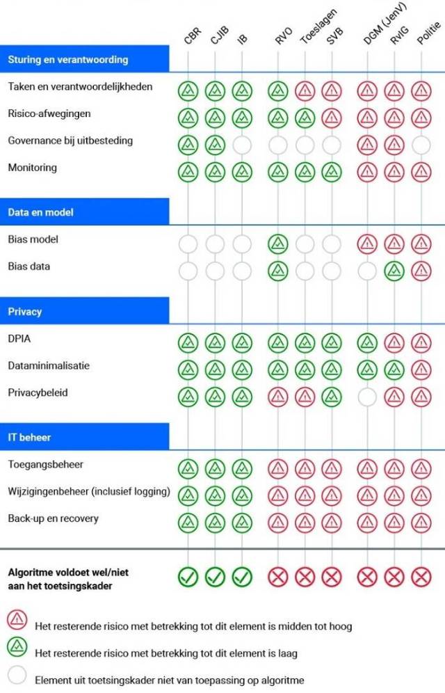 Onder meer werd onderzoek gedaan naar gebruik van algoritmes door de politie, zie ook onderstaand schema, waaruit blijkt dat de politiesystemen op geen enkel punt voldoen.