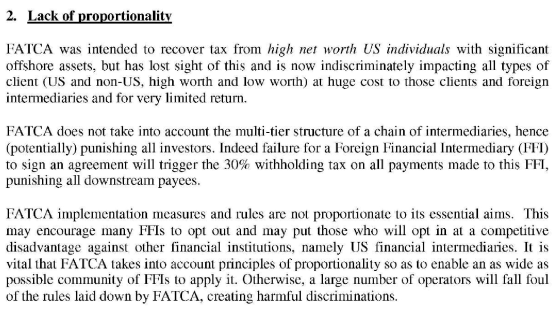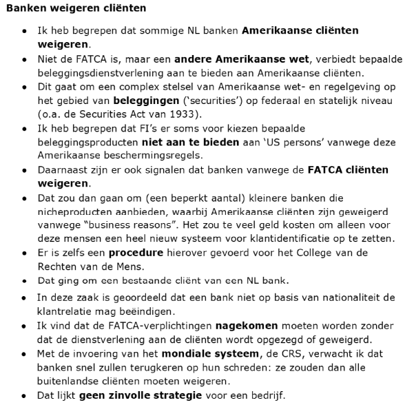 Ook was men destijds al op de hoogte van andere discriminatoire elementen in de Amerikaanse wetgeving, die er toe leiden dat mensen met Amerikaanse nationaliteit (ook al zijn ze fiscaal inwoner van de EU) door financiële instellingen worden geweigerd en weigert men daar maatregelen tegen te nemen:
