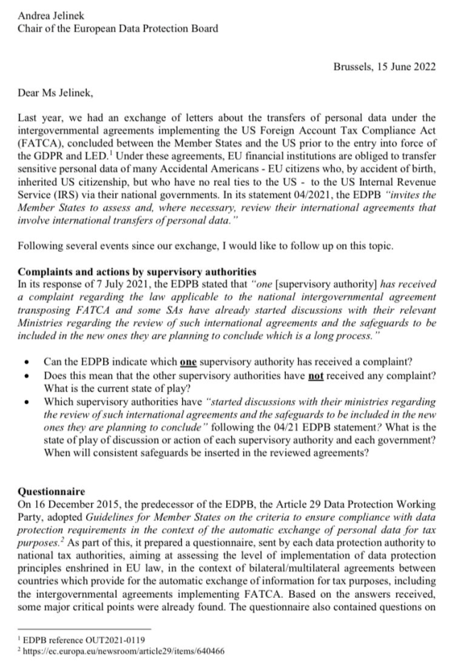 In Europa is nog steeds weinig bereikt voor de slachtoffers van FATCA, lees de brief die europarlementariër Sophie in’t Veld aan de voorzitter van de EDPB, het samenwerkingsverband van nationale AVG-toezichthouders, schreef: