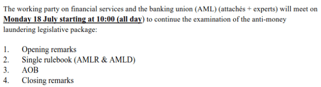 On Monday 18 July next, the Working Party on Financial Services and the Banking Union (Financial Services) of the European Council will be meeting all day about the AML package (meeting information, notice of meeting and provisional agenda).
