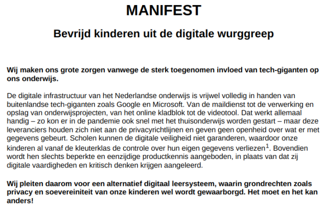 Onlangs is een petitie gestart onder de titel ‘Bevrijd kinderen uit de digitale wurggreep‘, waarin een coalitie van ouders, it’ers, docenten en privacy-voorvechters vraagt om een een ander beleid voor de digitale, online kanten van het onderwijs.