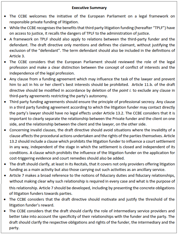 We are therefore supportive of the European Parliament’s legislative own-initiative report on responsible private funding of litigation, which calls on the European Commission to propose sensible safeguards for effective oversight of TPLF in all areas of law and types of litigation.