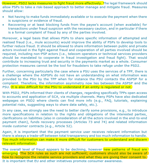 EBF constateert dat de sterke klantauthenticatie (‘strong customer authentication‘ / ‘SCA’) van PSD2 nuttig is maar dat criminelen als gevolg van SCA andere wegen hebben ingeslagen, zie onder meer pagina 15 van de bijdrage, waarin wordt gezegd: “PSD2 lacks measures to fight fraud more effectively” en wordt opgemerkt dat het voor klanten lastig is vast te stellen of een aanbieder onder toezicht staat, zie hierna de pagina met markering door mij:
