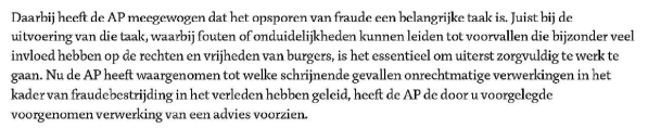 Lees in dat verband het advies van de Autoriteit Persoonsgegevens (AP) van 21 juli jl. over nieuwe plannen voor fraudeopsporing door de Belastingdienst, zoals recent bekend gemaakt. Dit advies wordt uitgebracht ondanks het feit dat de adviesaanvraag prematuur was. De AP besluit toch te adviseren en motiveert dit aldus: