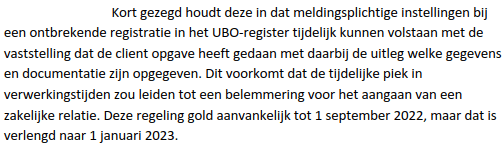 Voorts wordt ingegaan op de nieuwe ubo-bureaucratie, over hoe ondernemingen die zich bezig moeten houden met criminaliteitsbestrijding (in de brief ‘meldplichtige instellingen’ genoemd) moeten omgaan met hun verplichting om een ubo-uittreksel in het dossier te hebben, vóór de werkzaamheden voor een nieuwe relatie worden aangevangen.