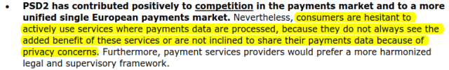 Het standpunt over PSD2 en open finance is voor burgers van belang. Opvallend is dat het ministerie veronderstelt dat PSD2 heeft bijgedragen aan toename van de mededinging, terwijl ook wordt vermeld dat rekeninginformatiediensten geen succes zijn omdat Nederlanders niet zoveel zin hebben om hun persoonsgegevens met jan en alleman te delen:
