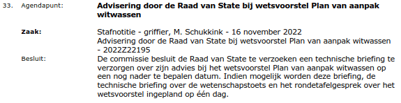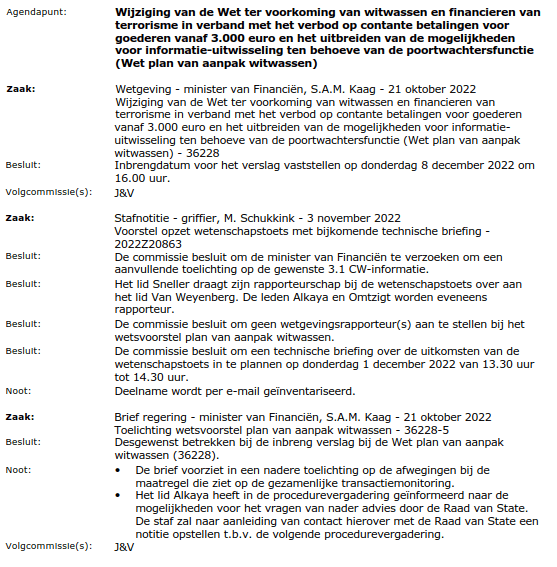 In de procedurevergadering van 10 november 2022 is gesproken over een voorgenomen wetenschapstoets bij het wetsvoorstel Plan van Aanpak Witwassen (36228). De commissie heeft besloten om u te verzoeken om een aanvullende toelichting met betrekking tot het vereiste conform artikel 3.1 van de Comptabiliteitswet 2016. De commissie verzoekt u deze informatie op korte termijn aan de Kamer te doen toekomen, zodat deze betrokken kan worden bij de wetenschapstoets die momenteel wordt uitgevoerd in aanloop naar de inbreng ten behoeve van het verslag.