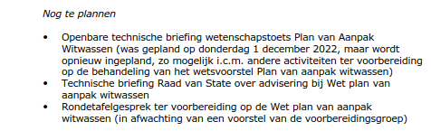 Bij overige activiteiten (36) staat een openbare technische briefing Wetenschapstoets Plan van Aanpak Witwassen vermeld, die op 1 december a.s. van 13:30 tot 14:30 uur zal plaats vinden.
