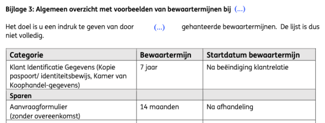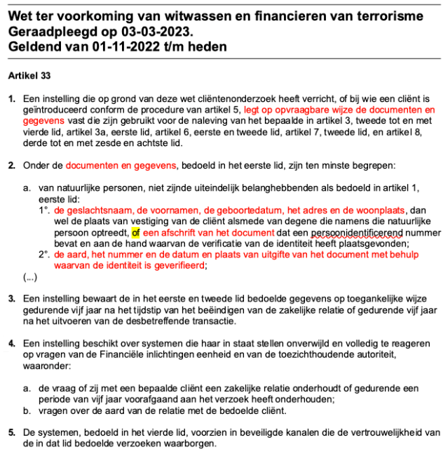Er wordt hier gesproken over een bewaartermijn van zeven jaar na het eindigen van de klantrelatie, terwijl in de Wwft staat dat de bewaartermijn van de gegevens van het Wwft-klantenonderzoek maar vijf jaar is [2]. Dus zeven jaar is zeker te lang. Zeven jaar is vermoedelijk de termijn uit het Burgerlijk Wetboek dat rechtspersonen de gegevens inzake hun vermogenstoestand moeten bewaren [3]. Daartoe behoren niet de ID’s van de klanten.