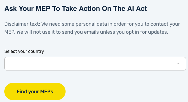 en vul je land in. Je krijgt dan een lijst van europarlementariërs en een concepttekst om aan hen te schrijven.
