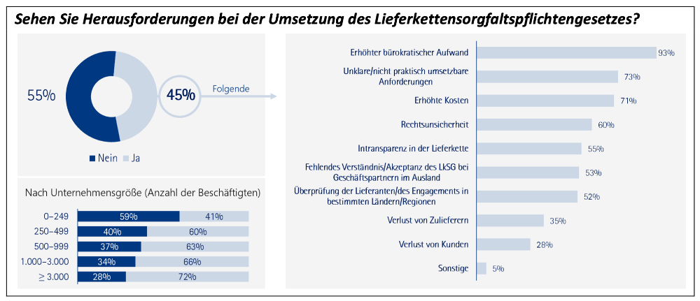 Und: In der Überprüfung der Lieferanten und des Engagements in bestimmten Ländern und Regionen sehen Betriebe aller Größenklassen eine Herausforderung. Knapp ein Viertel der großen Unternehmen denkt sogar über Rückzug und den Abbruch von Handelsbeziehungen nach – was die Diversifizierung der Lieferketten zusätzlich erschwert.
