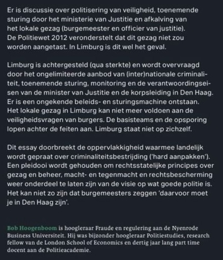 Vorige week was criminoloog Bob Hoogenboom (hoogleraar fraude) aanwezig bij de aanbieding van zijn boek over het falen van de rijksoverheid om te zorgen voor een goede organisatie en financiering van de politie (en de politiefunctie).