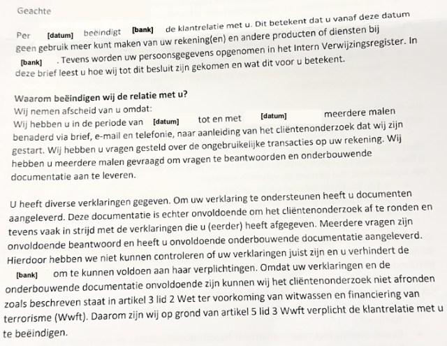 Onderstaand de motivering van een Nederlandse grootbank om de rekening van een consument op te zeggen en om de consument op de interne zwarte lijst (‘Intern Verwijzingsregister’) te plaatsen: