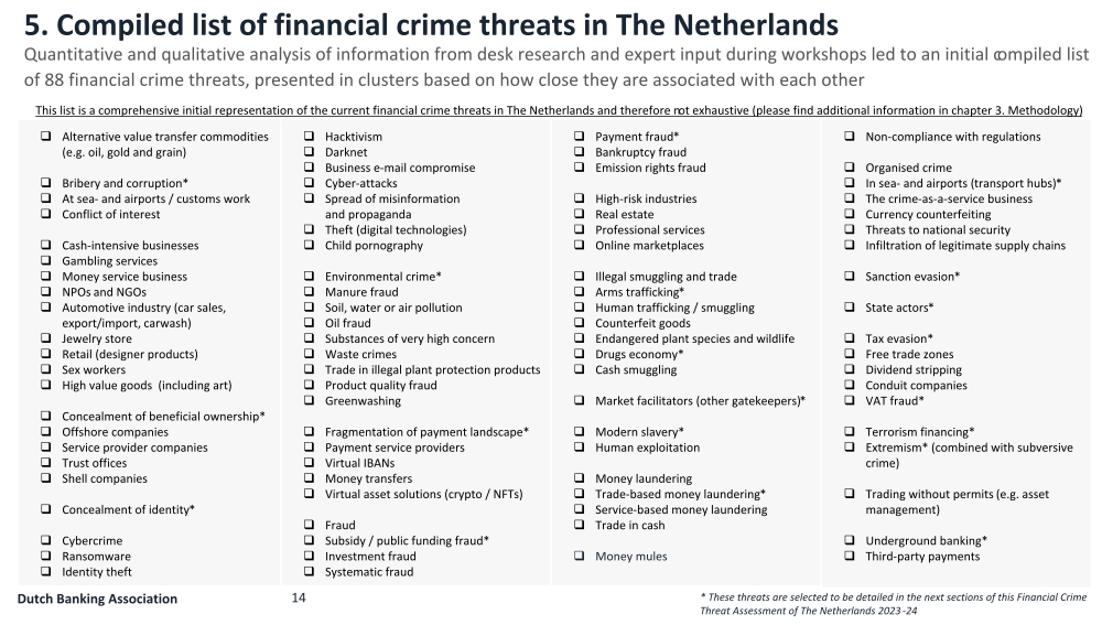 Dan volgt een volstrekt onzinnige en chaotische lijst van ‘financial crime threats’ wordt genoemd waarin allerlei branches en activiteiten verdacht worden verklaard, zoals alle not-for-profit organisaties en alle betaaldienstverleners [4], die in één adem worden genoemd met allerlei soorten misdaad (fraude, witwassen, tegenstrijdig belang):