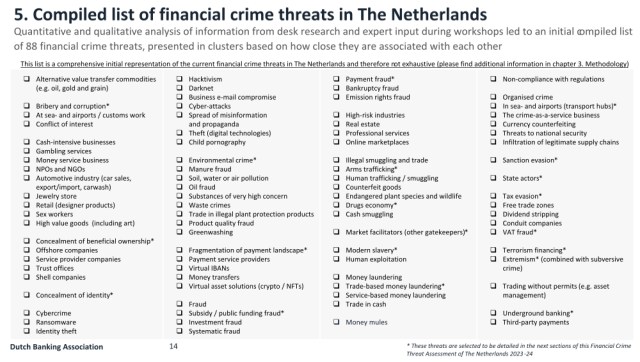 De grote vraag is of banken wel in staat zijn om de misdaden die in het lijstje staan (3, 4, 7, 8 en 9 zijn geen misdaden) op te sporen, aangezien dat specialistische kennis vereist die banken niet hebben. Zo vraag ik me af of banken wel voldoende kennis hebben van het belastingrecht in alle landen van de wereld, om de onder 16. en 20. genoemde misdaden op te sporen en aan de overheid te melden.