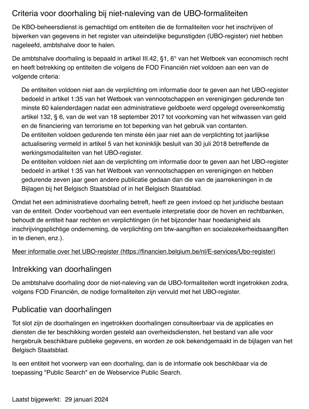 [2] Het fenomeen wordt door het Belgische ministerie van Financiën op deze pagina beschreven onder het kopje ‘Ambtshalve doorhaling wegens niet-naleving van de UBO-formaliteiten‘: