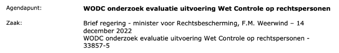 De Wet Controle op rechtspersonen staat op de agenda van de vaste commissie voor Justitie en Veiligheid, tijdens het debat Civielrechtelijke onderwerpen op 23 oktober a.s..