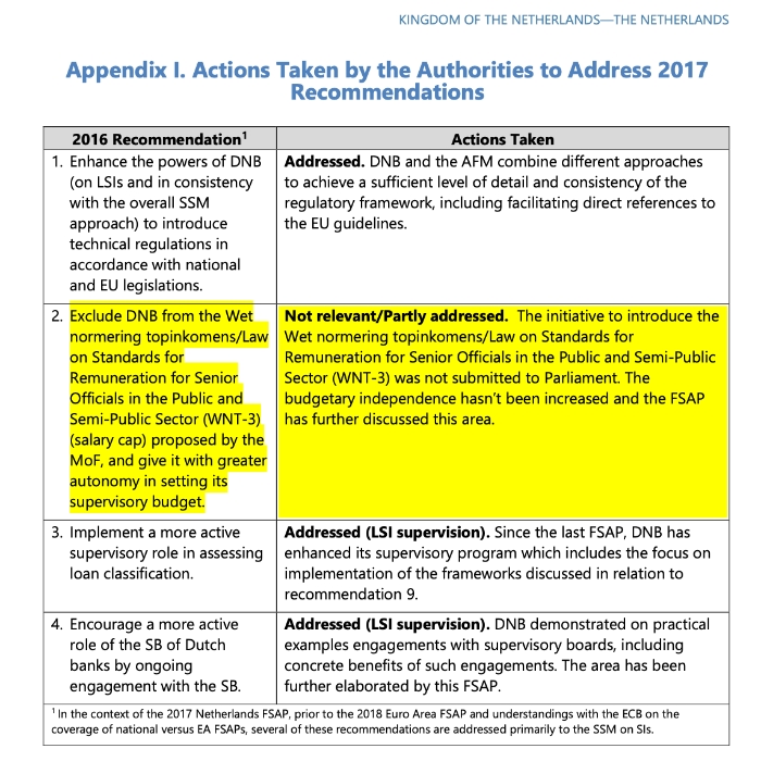 De financiële toppers hebben zulke goede contacten bij internationale financiële organisaties, dat ze zelfs het Internationaal Monetair Fonds (IMF) achter hun karretje hebben weten te spannen. In de Technical Note on Banking Supervision die het IMF in juni bekend maakte [2], staat een passage over de WNT (markering door mij):