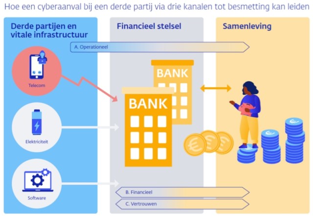 Zo kan een aanval op een derde partij – zoals een telecomprovider – de diensten van een financiële instelling tijdelijk stil leggen, waardoor ook andere financiële instellingen hier last van krijgen. Daarnaast kan een verstoring van de dienstverlening het vertrouwen in de financiële sector als geheel schaden.