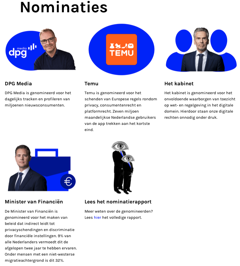De andere kandidaten voor de Big Brother Awards zijn mediabedrijf DPG Media, Temu en het kabinet: