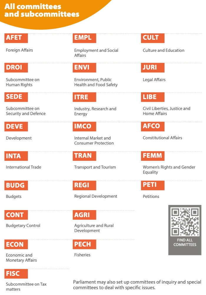 In dit Engelstalige bericht van het Europees Parlement (EP) wordt uitleg gegeven over de rol van de commissies die het EP kent, zie ook deze inleiding. Er is ook een brochure (pdf), waarin onderstaand overzicht van de commissies met de bijbehorende afkortingen is opgenomen: