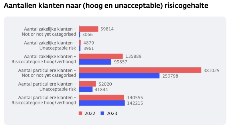 Daar worden wel gegevens verschaft over niet gecategoriseerde klanten, klanten met onacceptabel risico en klanten met hoog/verhoogd risico, terwijl het totale aantal klanten per categorie (zakelijk/particulier) ontbreekt. Door ontbreken van deze informatie kunnen de aantallen niet in context worden geplaatst.