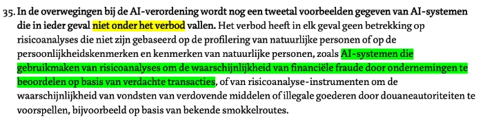 “het in de handel brengen, het voor dit specifieke doel in gebruik stellen of het gebruiken van een AI-systeem voor risicobeoordelingen van natuurlijke personen om het risico dat een natuurlijke persoon een strafbaar feit pleegt te beoordelen of te voorspellen, uitsluitend op basis van de profilering van een natuurlijke persoon of op basis van de beoordeling van diens persoonlijkheidseigenschappen en -kenmerken; dit verbod geldt niet voor AI-systemen die worden gebruikt ter ondersteuning van de menselijke beoordeling van de betrokkenheid van een persoon bij een criminele activiteit, die reeds op rechtstreeks met de criminele activiteit verband houdende objectieve en verifieerbare feiten is gebaseerd;”
