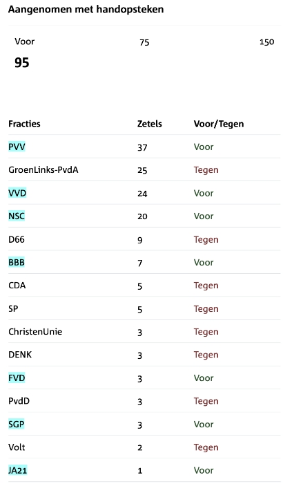 Vóór werd gestemd door: Wijen-Nass, Wilders, Yeşilgöz-Zegerius, Aardema, Becker, De Beer, Bevers, Bikkers, Blaauw, Boon, Van den Born, Martin Bosma, Boutkan, Buijsse, Van der Burg, Van Campen, Claassen, Crijns, Deen, Tony van Dijck, Diederik van Dijk, Emiel van Dijk, Dral, Eerdmans, Van Eijk, Ellian, Erkens, Esser, Faddegon, Flach, Graus, Peter de Groot, Van Haasen, Hartsuiker, Van der Hoeff, Van Houwelingen, Léon de Jong, Kisteman, Kops, De Kort, Markuszower, Martens-America, Van Meetelen, Van Meijeren, Meulenkamp, Michon-Derkzen, Mooiman, Edgar Mulder, Nijhof-Leeuw, Oostenbrink, Pierik, Van der Plas, Pool, Rajkowski, Ram, Rep, Richardson, Rikkers-Oosterkamp, De Roon, Smitskam, Stoffer, Thiadens, Uppelschoten, Valize, Van der Velde, Veltman, Verkuijlen, Vermeer, Vlottes, Vondeling, De Vree en Aukje de Vries.