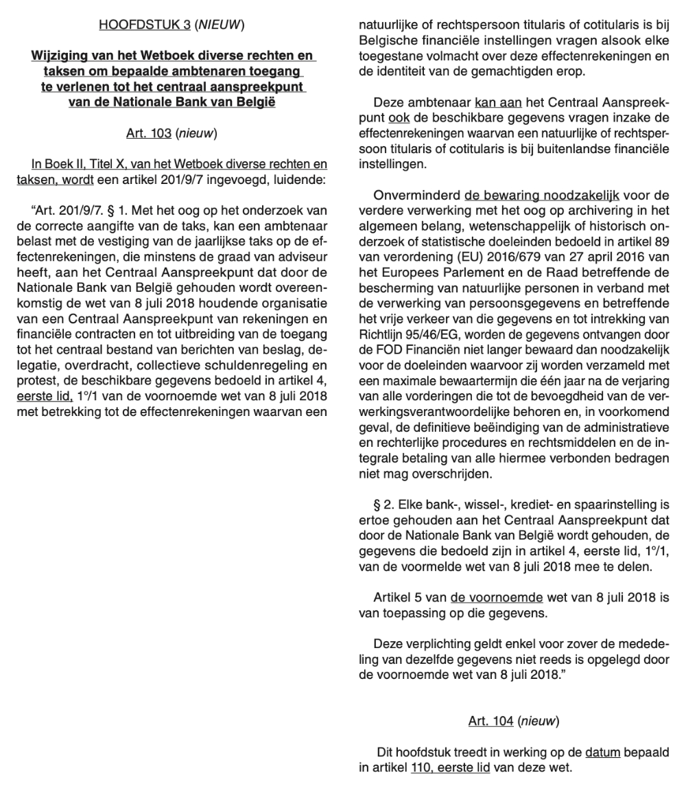 De aangenomen tekst is hier (pdf) te vinden [*]. Op pagina 37 en 38 is een tekst te vinden over ‘Wijziging van het Wetboek diverse rechten en taksen om bepaalde ambtenaren toegang te verlenen tot het centraal aanspreekpunt van de Nationale Bank van België‘.