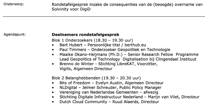 Rondetafelgesprek inzake de consequenties van de (beoogde) overname van Solvinity voor DigiD – dinsdag 27 januari 2026 van 18.30 – 20.30 uur