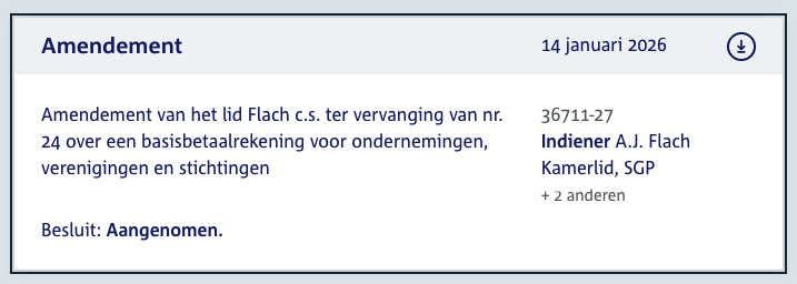 Human Rights in Finance (HRIF.EU) liet weten dat het amendement over de zakelijke basisbankrekening is aangenomen door de Tweede Kamer.