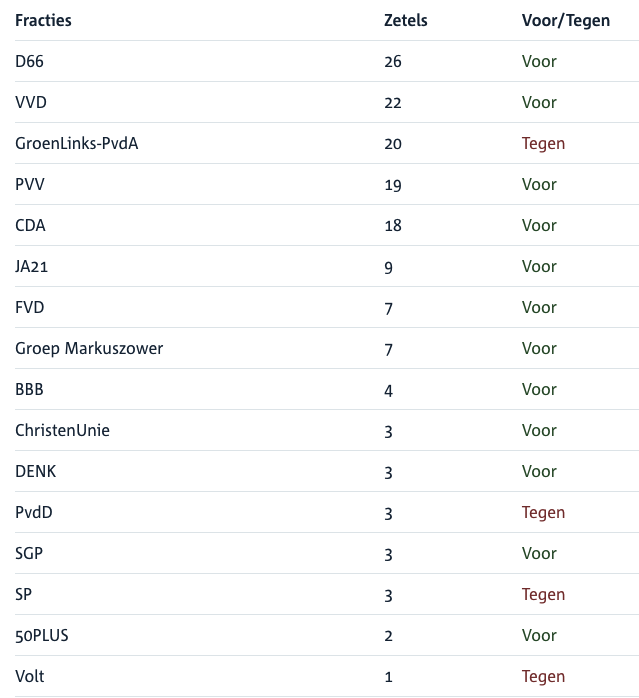 Aangenomen. Voor: SP, 50PLUS, GroenLinks-PvdA, D66, Volt, PvdD, DENK, SGP, ChristenUnie, JA21, BBB, PVV, FVD en Groep Markuszower.